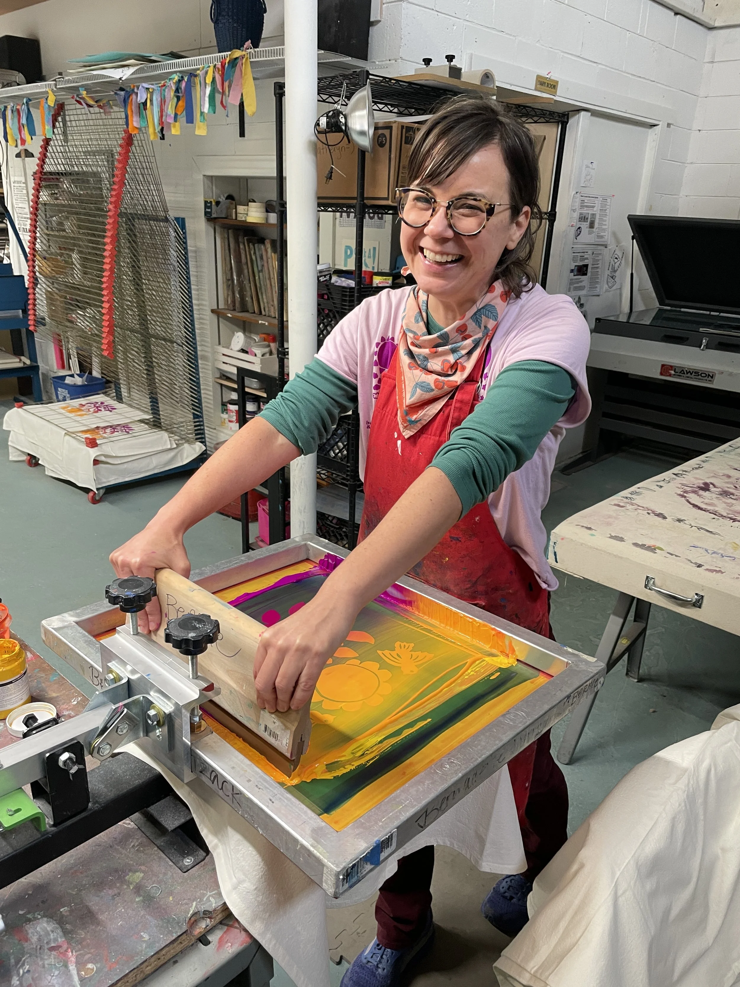 Bernie has been making art since she could hold a crayon, screen printing for 10+ years, and works full-time as an artist with her small batch, hand-printed apparel and home goods brand, bernie & zuzu. She has extensive experience teaching screen printing, block printing, fabric painting and drawing. She has taught children, teens and adults at the Arts + Literature Laboratory, the Textile Art Center, Pinney Library, and Polka! Press. Bernie earned a BA in Studio Art from Beloit College, a MA in Public Service from Marquette University, an MFA in Fine Art from the University of Michigan, and an AA in Graphic Design from Madison College.
