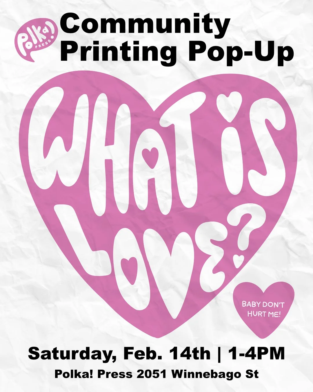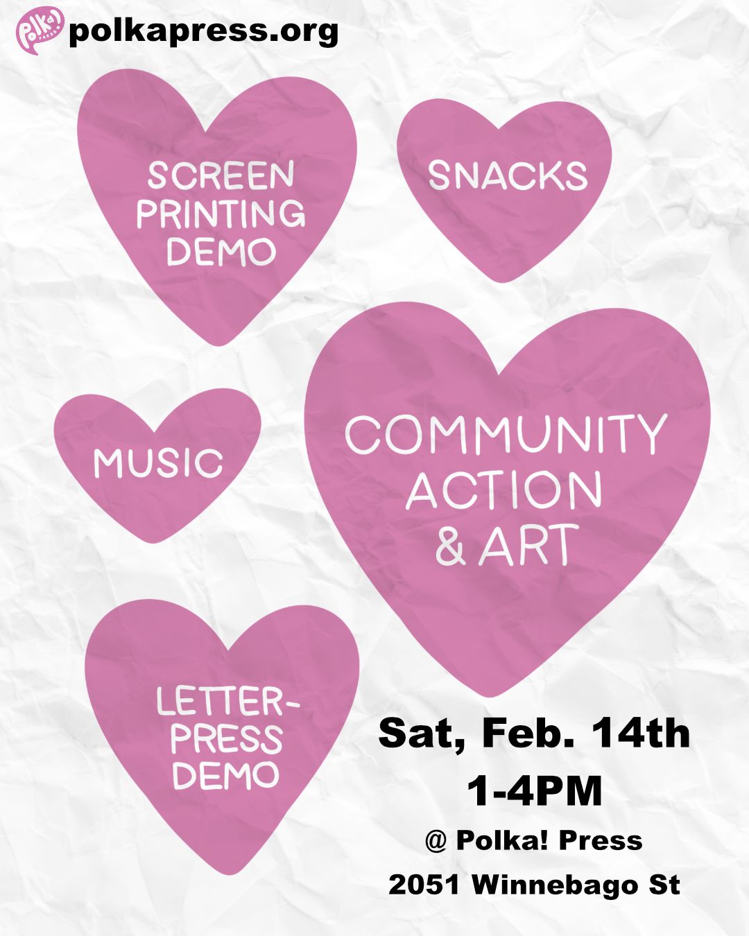 Join Polka! Press members for an afternoon of printing and community building as we share our visions for a community rooted in love. Participants will get the chance to screen print and letterpress with Polka! members and respond to the prompt “love is:”. Come with your visions for a strong community, leave with your very own print to share with the world. This event is free and no prior printing experience is needed. We hope to see you there!